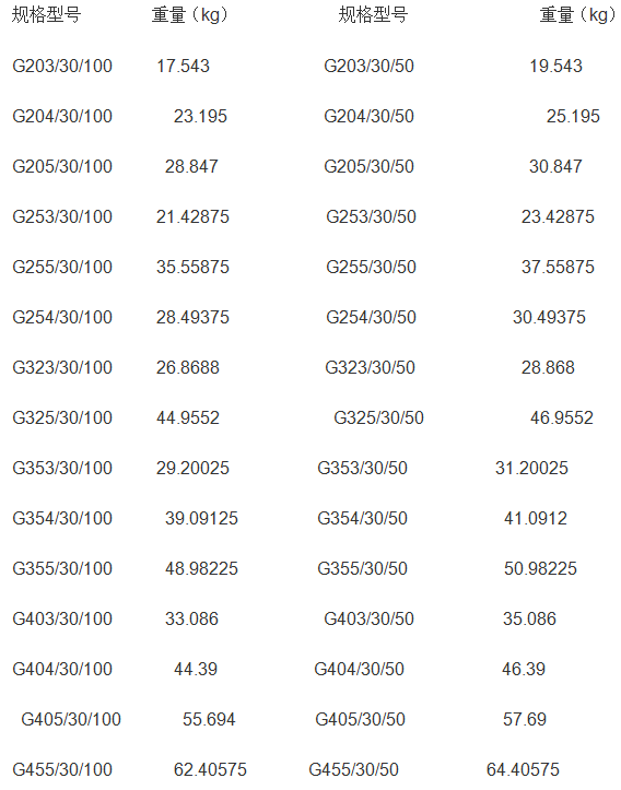 钢格栅踏步板是由扁钢和麻花钢按照一定的孔距排列然后点焊而成的,它的规格有G303/30/100 、 G405/30/100、G605/30/50等多种规格,G表示热镀锌,303 405 605表示扁钢的宽度和厚度,30/100表示孔的大小。镀锌钢格栅踏步板理论重量表见下图:例如G303/30/100格栅板理论重量为17.543公斤,G303/30/100的钢格栅步板理论重量为21.9公斤。