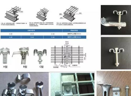 B型安装夹:由一块带双钩的上压板(其间一个钩可将相邻的两块网格板括在一起),一块带齿的下压板和一支>M8的内角螺栓组成。